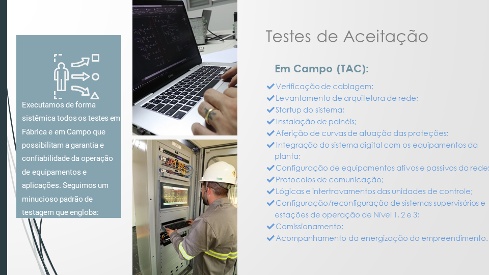 Atuamos com excelência na instalação de relés de proteção multifuncionais, controladores, gateways e produtos SCADA/IHM, trabalhando de forma sistêmica e seguindo todas as diretrizes e normas desde o projeto elétrico até a configuração e comissionamento dos sistemas.